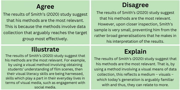 Granted, it will probably take more than just one sentence (though not always) to reflect the four examples above pertaining to engagement, and two sentences do not a paragraph make. But the key point here is so far, so good. The writer is on their way to engagement with the literature - here, a study by Smith (2020) - by means of choosing one of four ways that demonstrate engagement. There are other ways, of course, such as finding links between studies and combining them to bolster a particular argument that you wish to make. But the four methods outlined here will provide you with concrete ways to engage with the literature and again, demonstrate a critical approach to your writing.